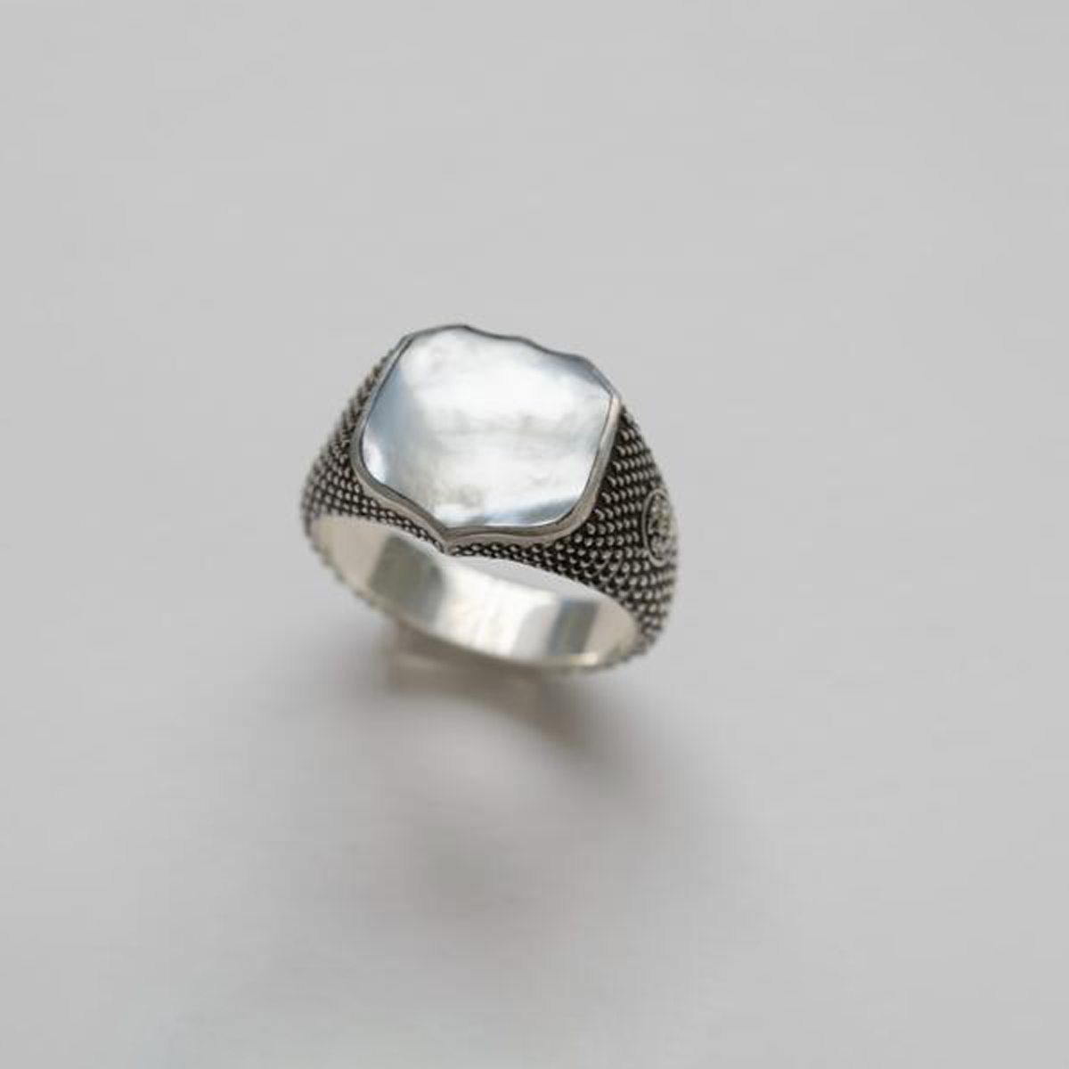 Crafted in the timeless signet style, the Mother of Pearl Lion Signet Ring features a distinguished design with a captivating lion motif intricately detailed with luminous mother of pearl. The iridescence of the mother of pearl adds a touch of elegance and sophistication to this statement piece. With a textured body, this ring exudes both strength and refinement, making it a standout piece in any collection.