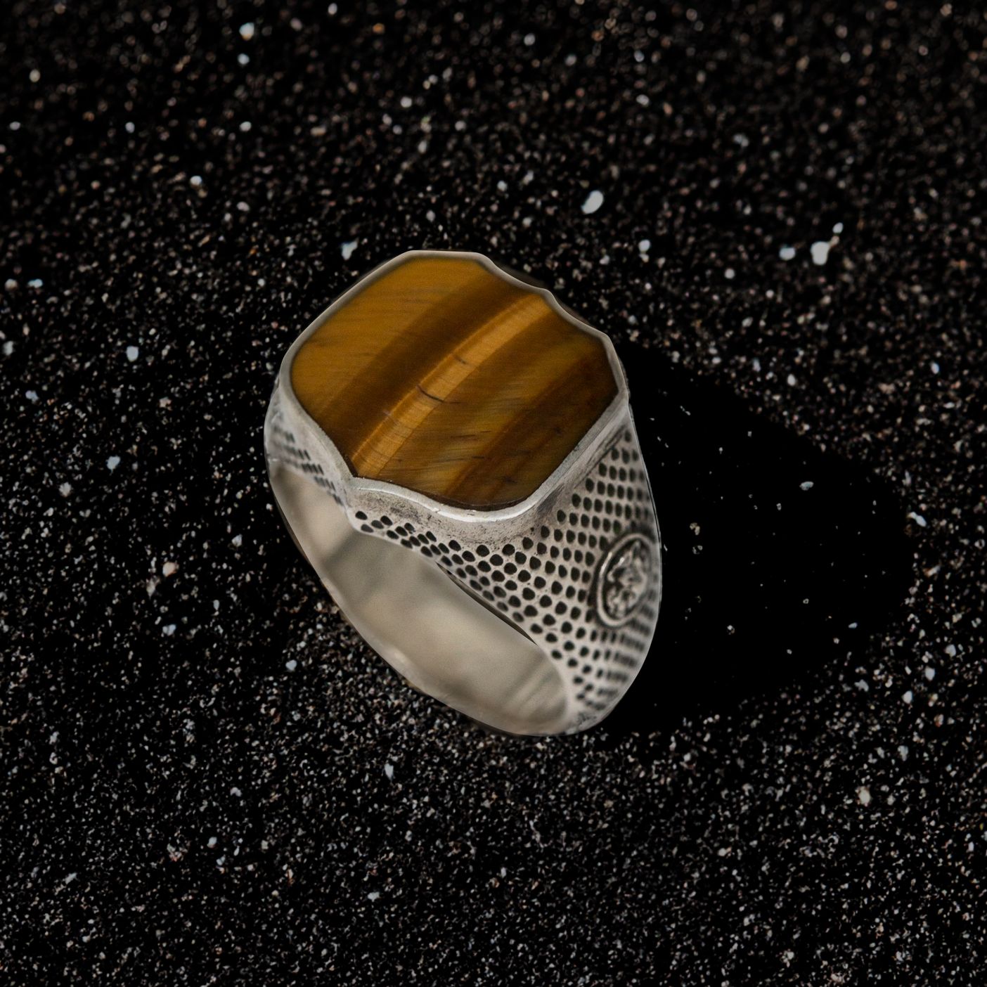 Crafted in the timeless signet style, the Tiger's Eye Lion Signet Ring embodies strength and resilience. Featuring a striking lion motif intricately detailed with a mesmerizing tiger's eye stone, this ring exudes a sense of power and confidence. The rich golden-brown hues of the tiger's eye add depth and character to the design, making it a bold statement piece for any occasion.